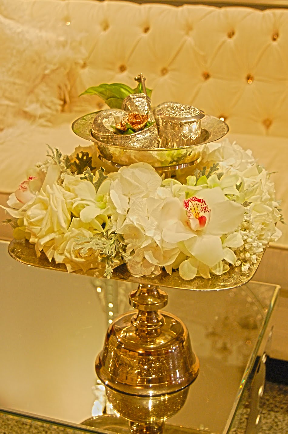 a certain customary practice by the royals dictates that the gift items for a hantaran, except for the tepak sirih, should not be ostentatiously displayed upon their carrying vessels. for this little known fact, the client who commissioned us to adorn her hantaran set provided these interesting covers to veil her gift items. but thankfully, the practice does not prohibit overt display of the floral garnishing.